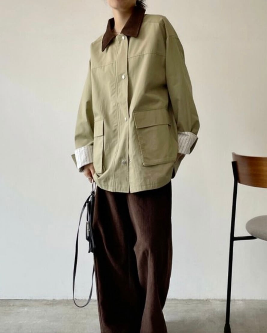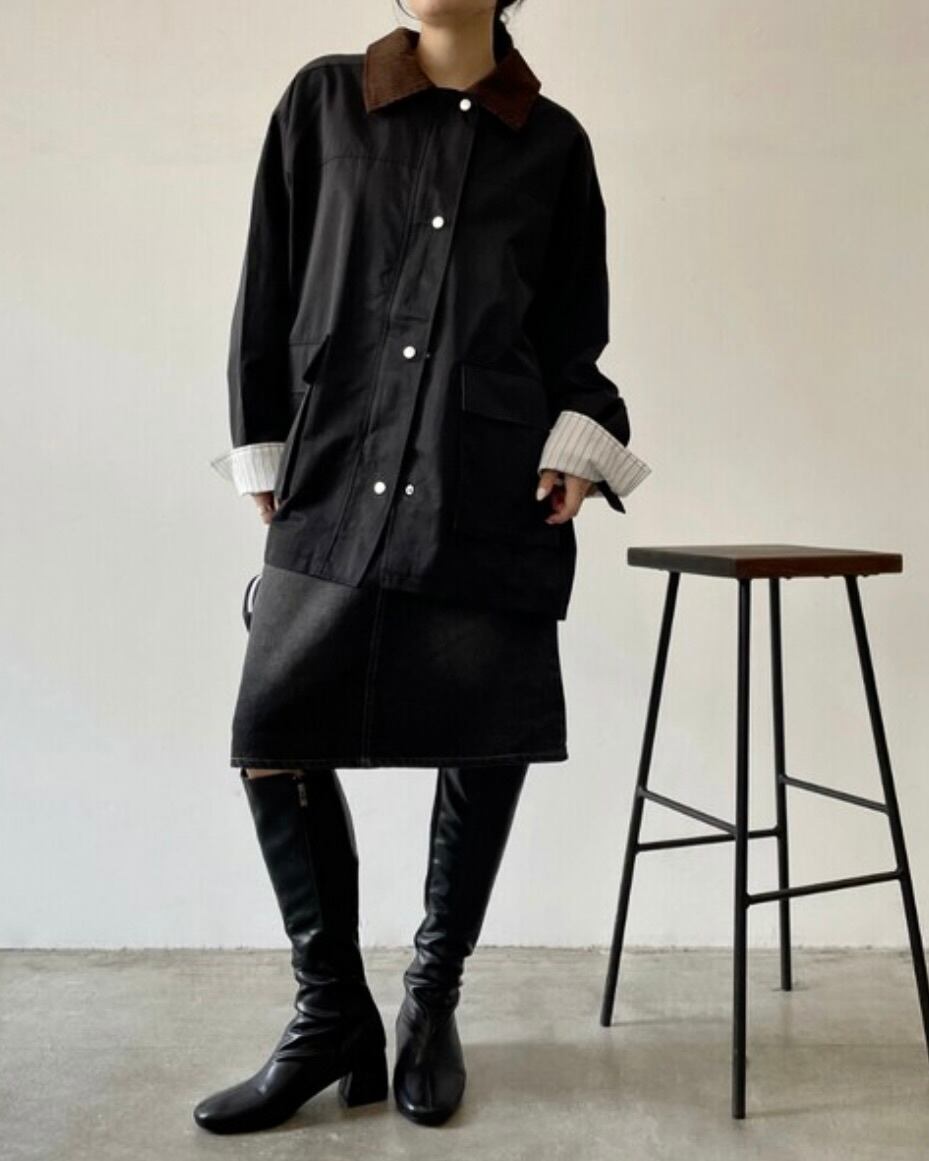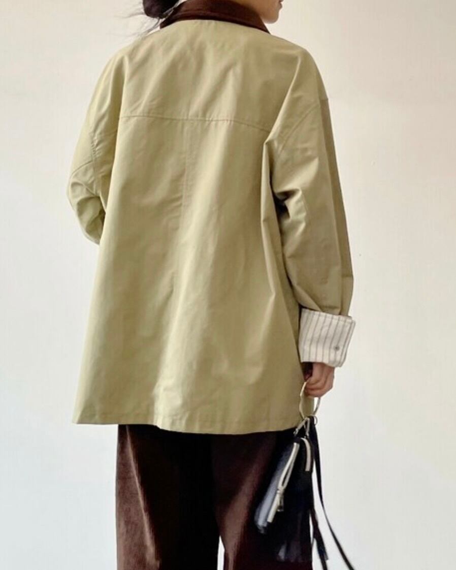 襟元には太畝コーデュロイを使用し、シンプルながらも季節感を引き立てるデザイン。