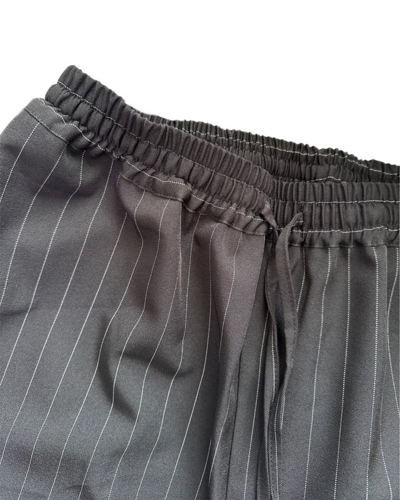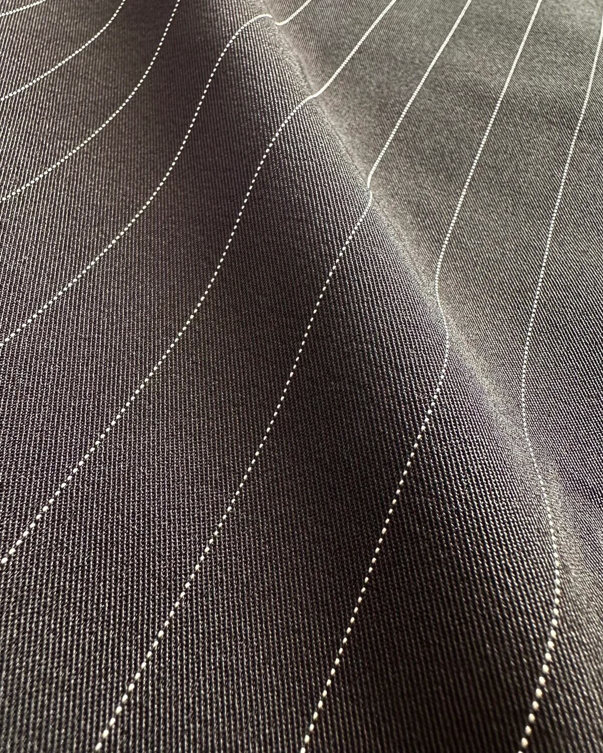 ベースに緻密なピンストライプを施した生地を使用し、サイドにラインを決めたストレートパンツ。
