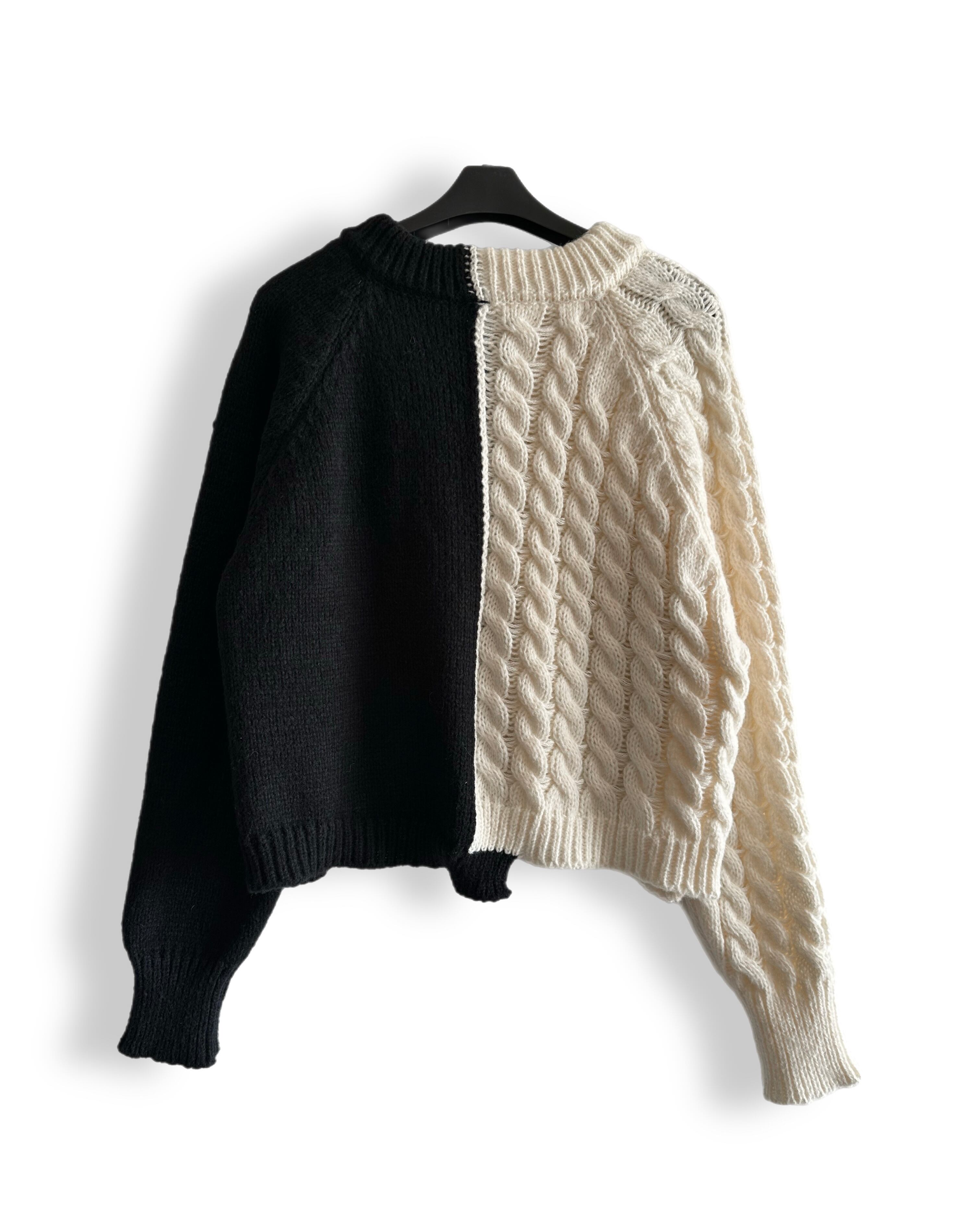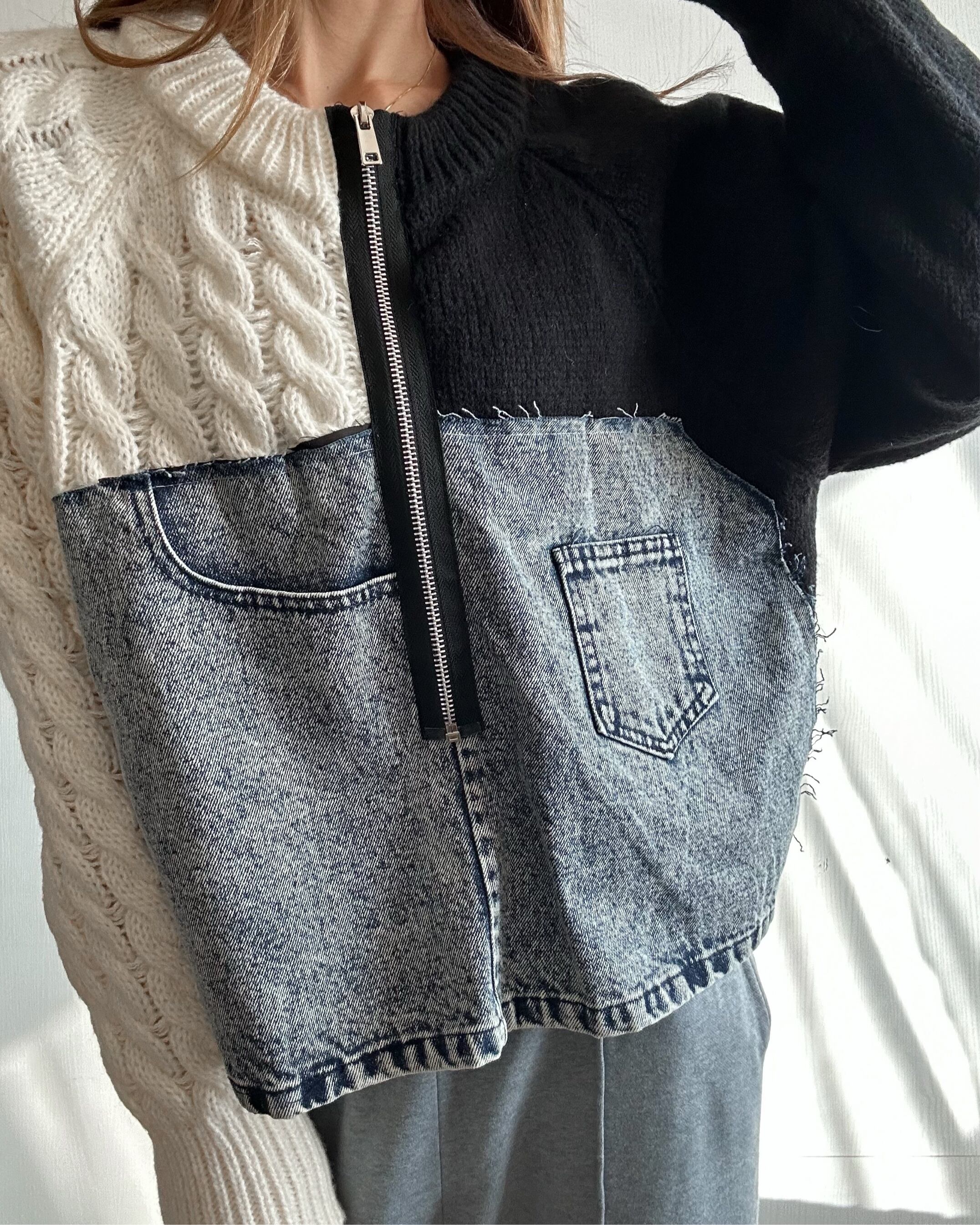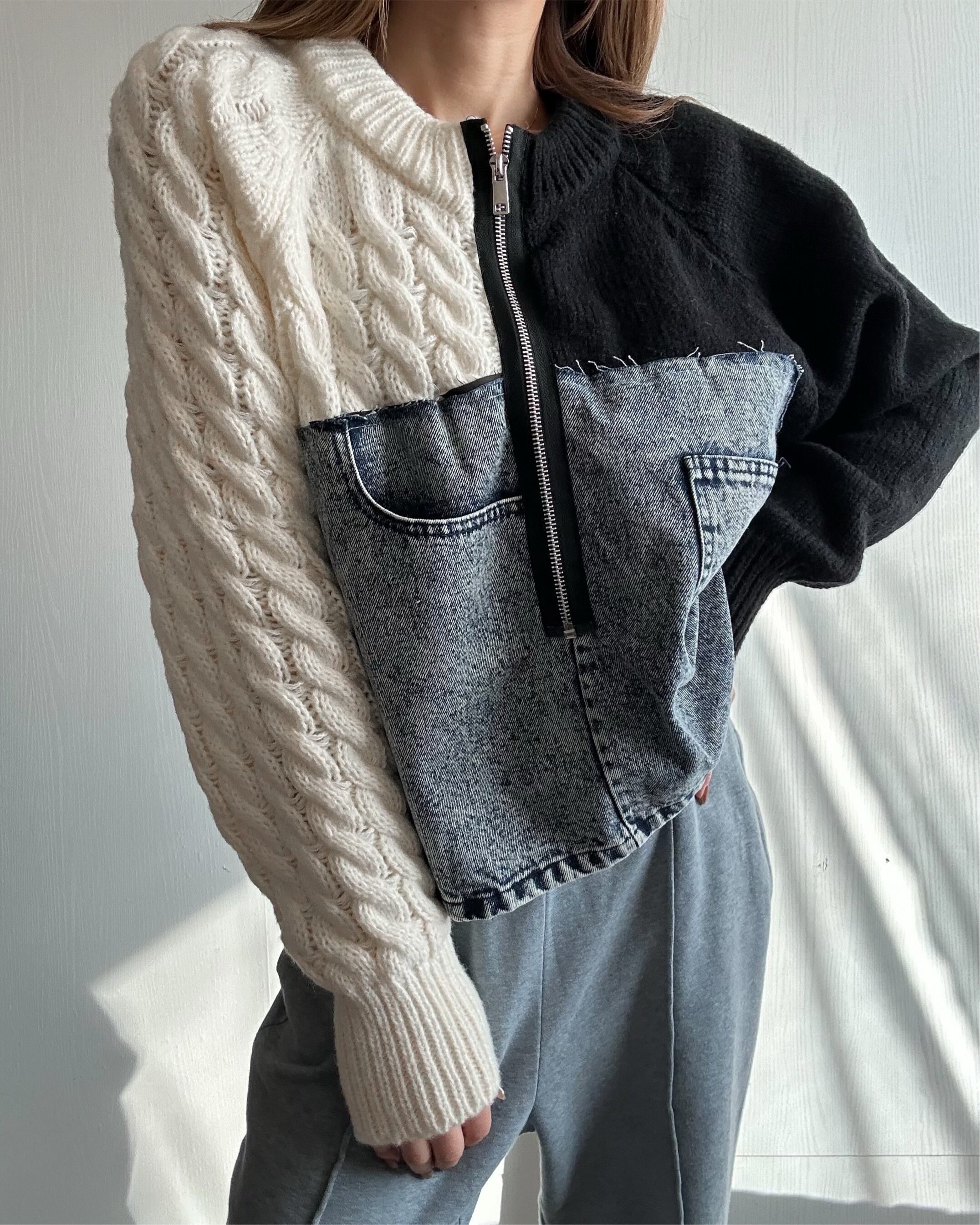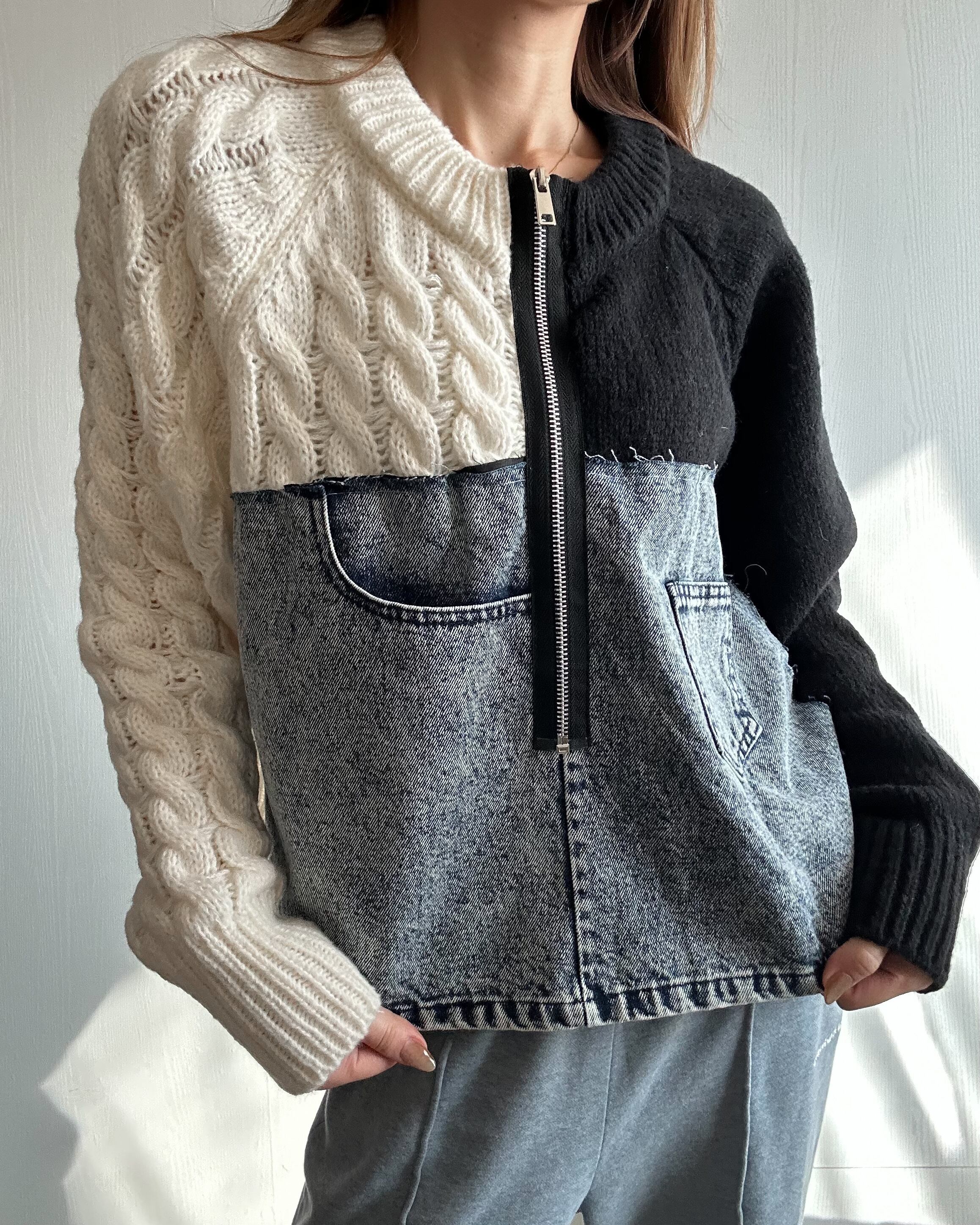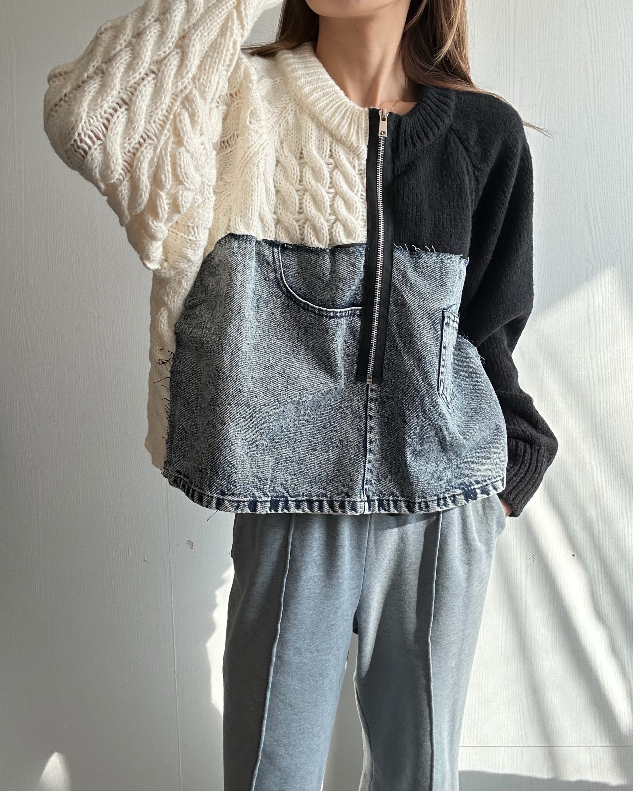 ・立体感のあるケーブル編みニット ・ヴィンテージライクなデニム切り替え ・開閉でニュアンスを変えられるハーフジップ ・一枚でサマになるリメイク風デザイン